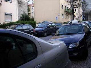 Logo pela manhã, os automóveis chegam e invadem a cidade; nalgumas zonas, roubam aos residentes os poucos lugares de estacionamento ainda existentes e ocupam selvaticamente os passeios, obrigando os peões a circular na estrada... Curioso é que, logo ali ao lado, há dezenas de lugares de estacionamento vagos..., mas daqueles da EMEL, a pagar. É claro que esta gentinha, que tem carro mas que, provavelmente, não tem dinheiro para o estacionamento, foge para estes redutos lisboetas e quem se lixa é quem lá reside, porque não tem lugar de residente, como acontece nas zonas já tomadas pela EMEL e acaba por não ter onde estacionar, na rua onde reside, a não ser entre sábado à tarde e Domingo; durante a semana, se retirar o carro de ao pé da porta, o melhor, mesmo, é ir estaciná-lo à porta da Câmara, a ver se lhe resolvem o problema... Raio que os parta! Que venham de T.P.!...