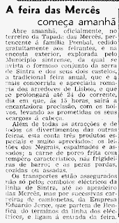 "A Câmara Municipal de Sintra organiza a Feira das Mercês - Feira saloia de Sintra, uma das feiras mais emblemáticas do concelho, com animação etnográfica saloia, gastronomia, bancas de artesanato e espetáculos de palco, dias 16, 17, 18, 23, 24 e 25 de outubro. ..." (daqui)